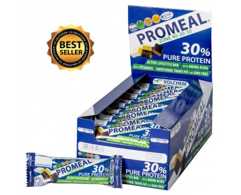 Φυσική μπάρα με 30% πρωτεΐνη και μοναδικές γεύσεις, βασισμένη στην θερμιδική κατανομή 40-30-30 (υδατανθράκων-πρωτεϊνών-λιπών). Η μοναδική σύνθεση της promeal ευνοεί τη μείωση του λίπους. Όλα τα φυσικά συστατικά της με την καλύτερη ποιότητα είναι εύπεπτα και παρέχουν ενέργεια.